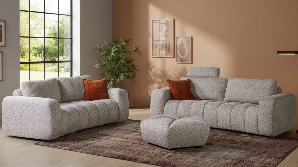 Ce salon présente un ensemble harmonieux composé de deux assises spacieuses et d’un pouf assorti, le tout habillé d’un tissu clair texturé. Les lignes arrondies et les coussins décoratifs apportent une touche soignée à l’ensemble.