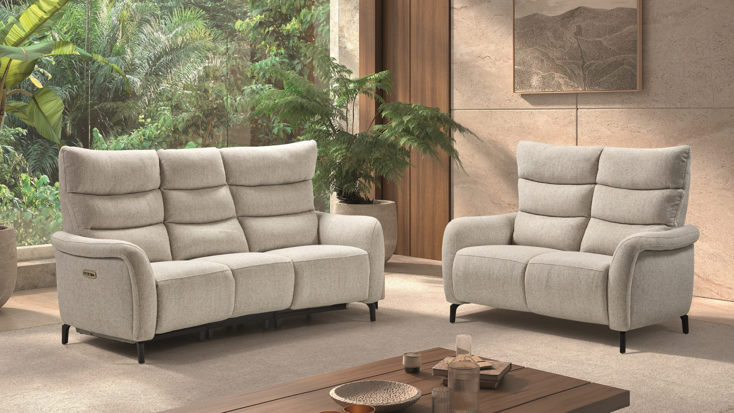 Structure bois massif avec équerres renforcées. Suspension ressorts métalliques zigzag pour l’assise et de sangles pour le dossier. Assise ressort ensaché recouvert de mousse polyuréthane de 30 kg/m3 de densité. Dossier et accoudoirs bras rempli de mousse de polyuréthane de de 28 kg/m3. Dossier rempli de mousse de polyuréthane de 18 kg/m3 de densité et de fibre vierge siliconé. Mécanisme de relax électrique avec moteur de résistance maximum 120 kg. Système électrique par bouton latéral pour ouverture du dossier et repose pieds. Têtières électriques. USB et USB type C sur le bouton. Tablette sur le siège du milieu. Revêtement en tissu NOLIO, 100% Polyester.