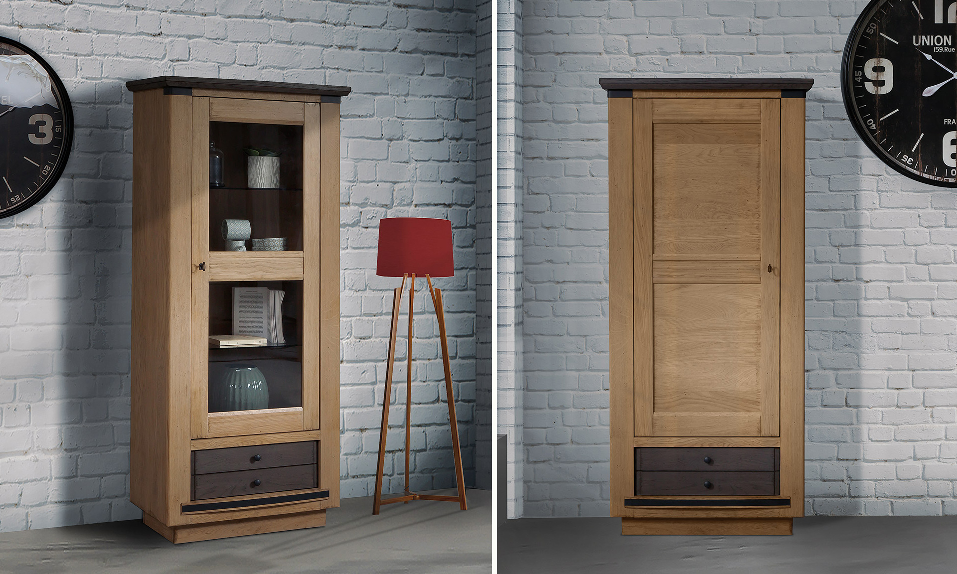 Structure 100% chêne massif de France. Meuble sur socle en retrait. Insertion décor métallique gris foncé. Finition chêne anthracite et antiquaire. Colonne : 1 porte vitrée, 1 tiroir. Tablettes en verre grisé.